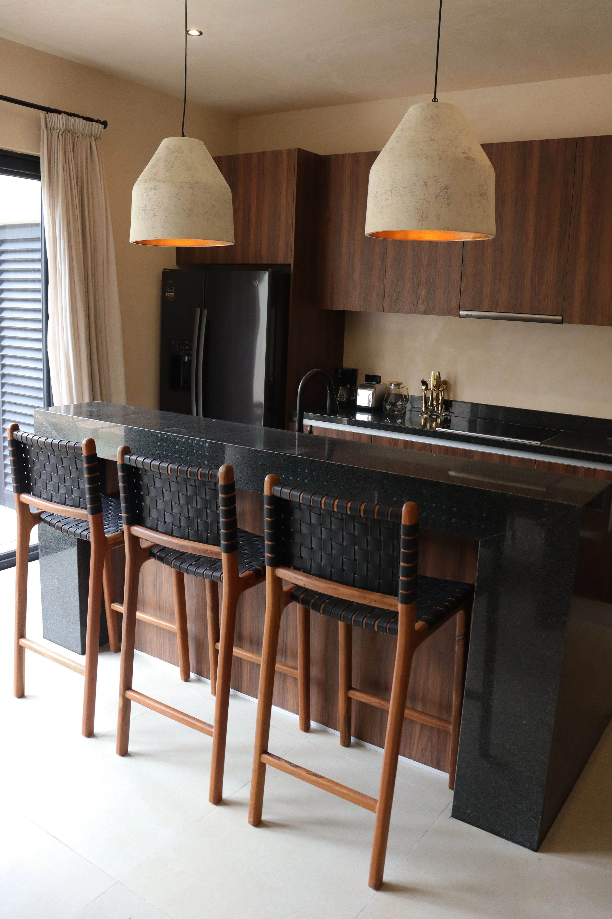 Lámparas de barro, sillas altas de madera de jabín con piel color negro.